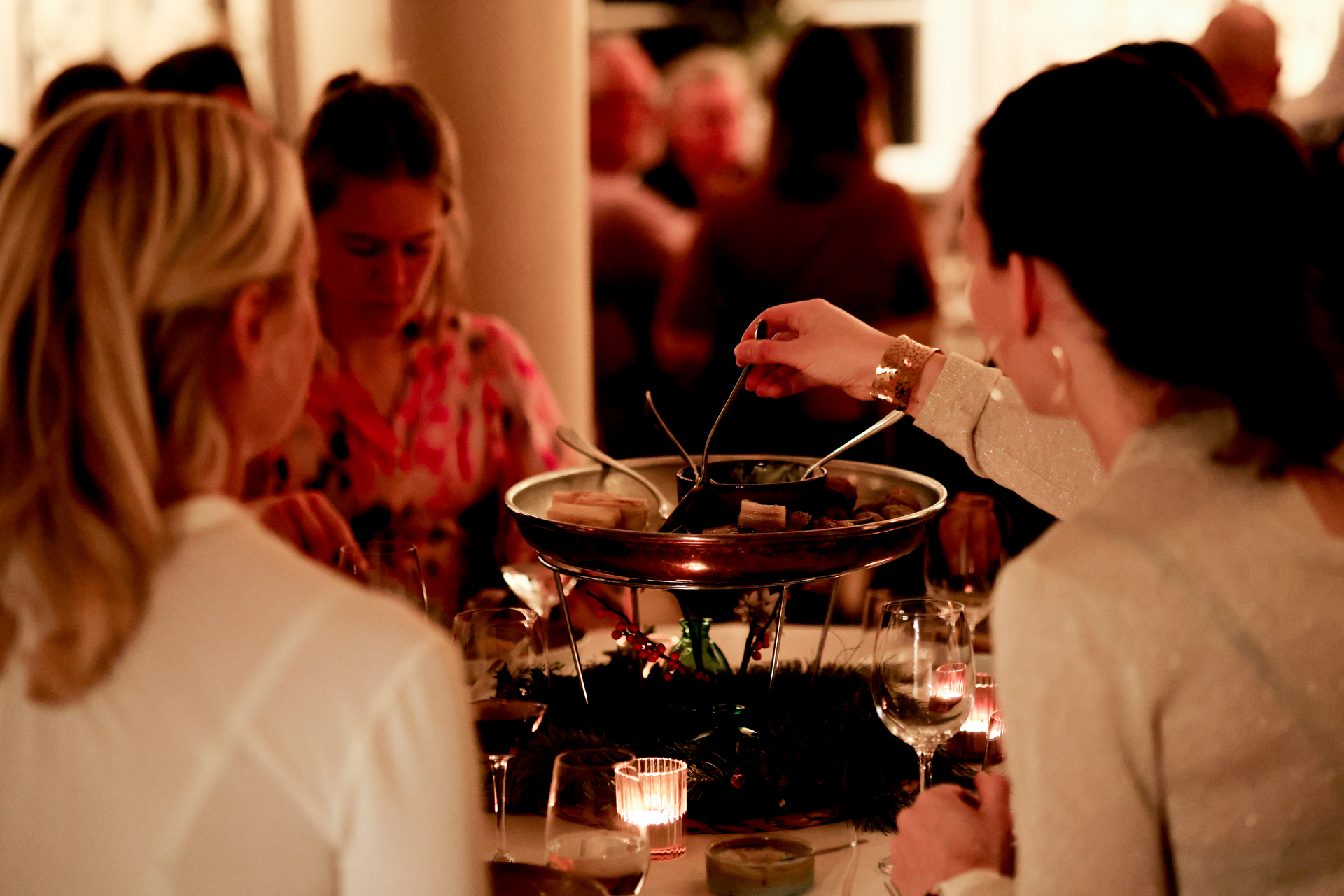 Julbord i sharingtappning – 5 varv direkt till bordet i fyra omgångar. Avsluta med dessert- och gottebuffé.