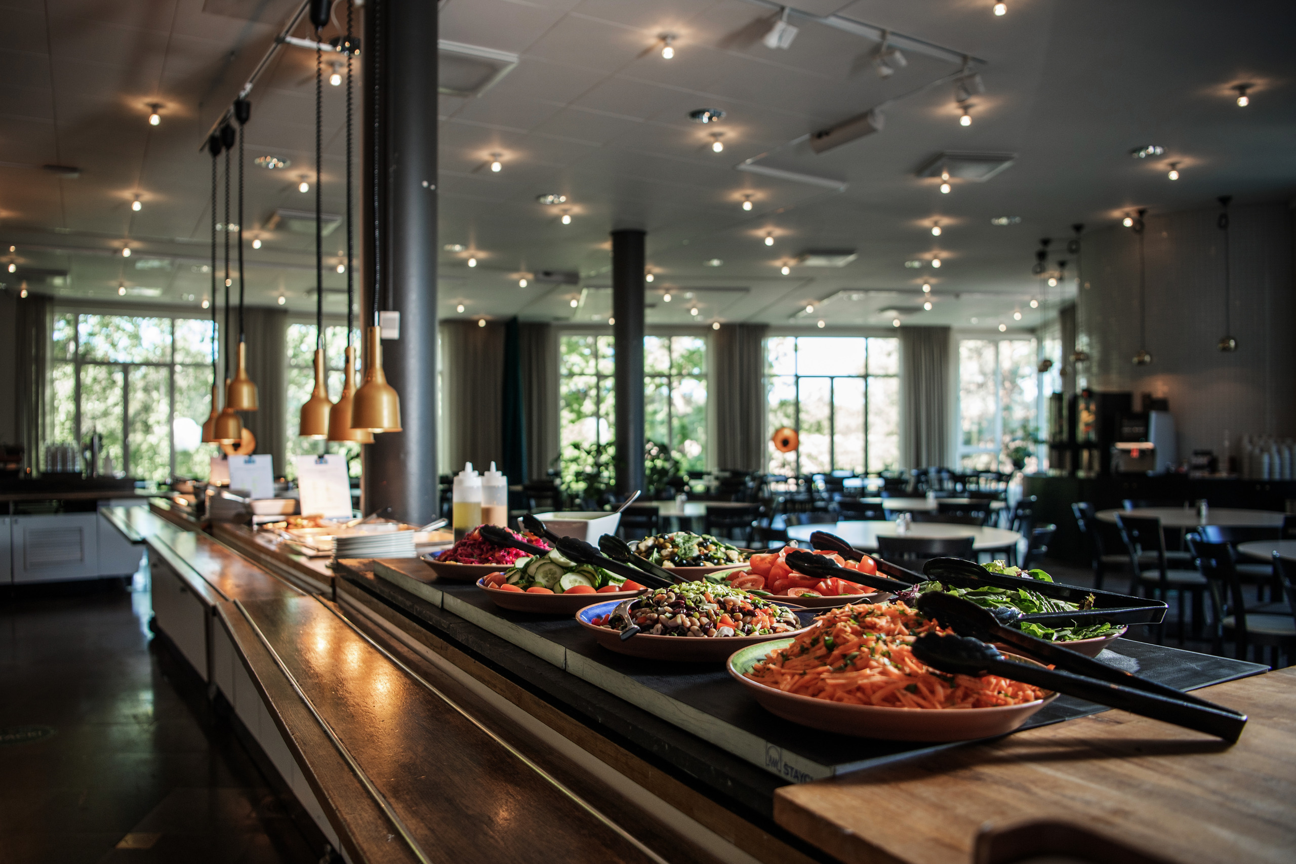 Till lunch och middag finns alltid en vegetarisk rätt, en fiskrätt och en kötträtt att välja på, samt salladsbuffé, bröd och kaffe.